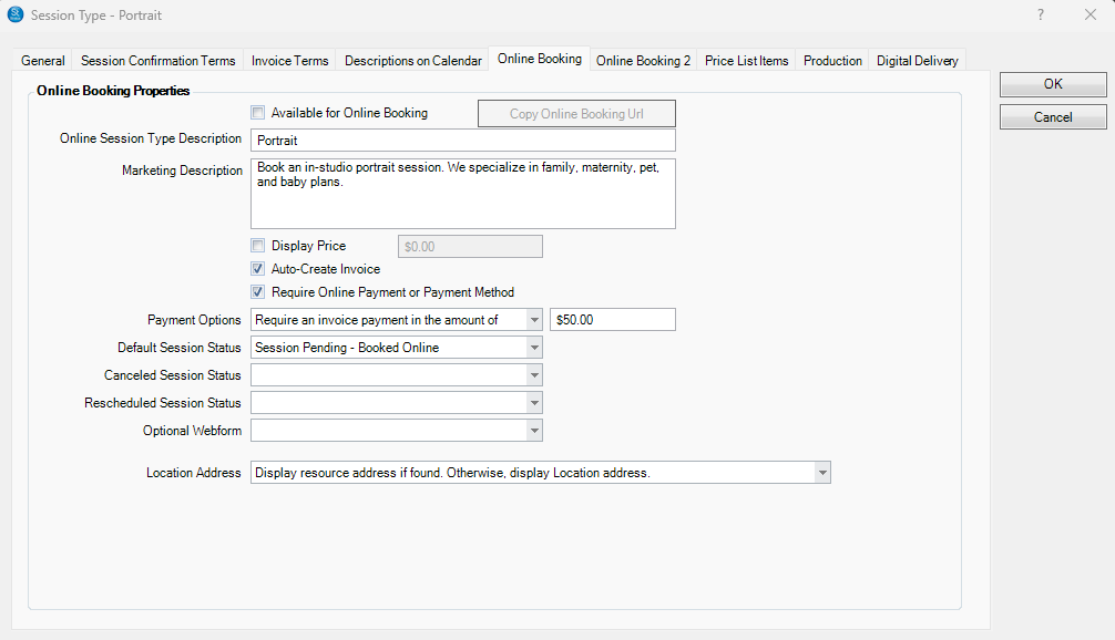 The Online Booking tab (available in myStratus ) is where you choose online settings for a session type so you can offer it for online booking. Enabling a session type for online booking will include it in your list of sessions on your online booking page. You will also have the ability to choose a specific Web Form for the Session Type. It will NOT allow people to book a session until you choose specific time slots that can be scheduled. For detailed setup information, see Setting Up Online Booking, Scheduling Time Slots and Web Forms.